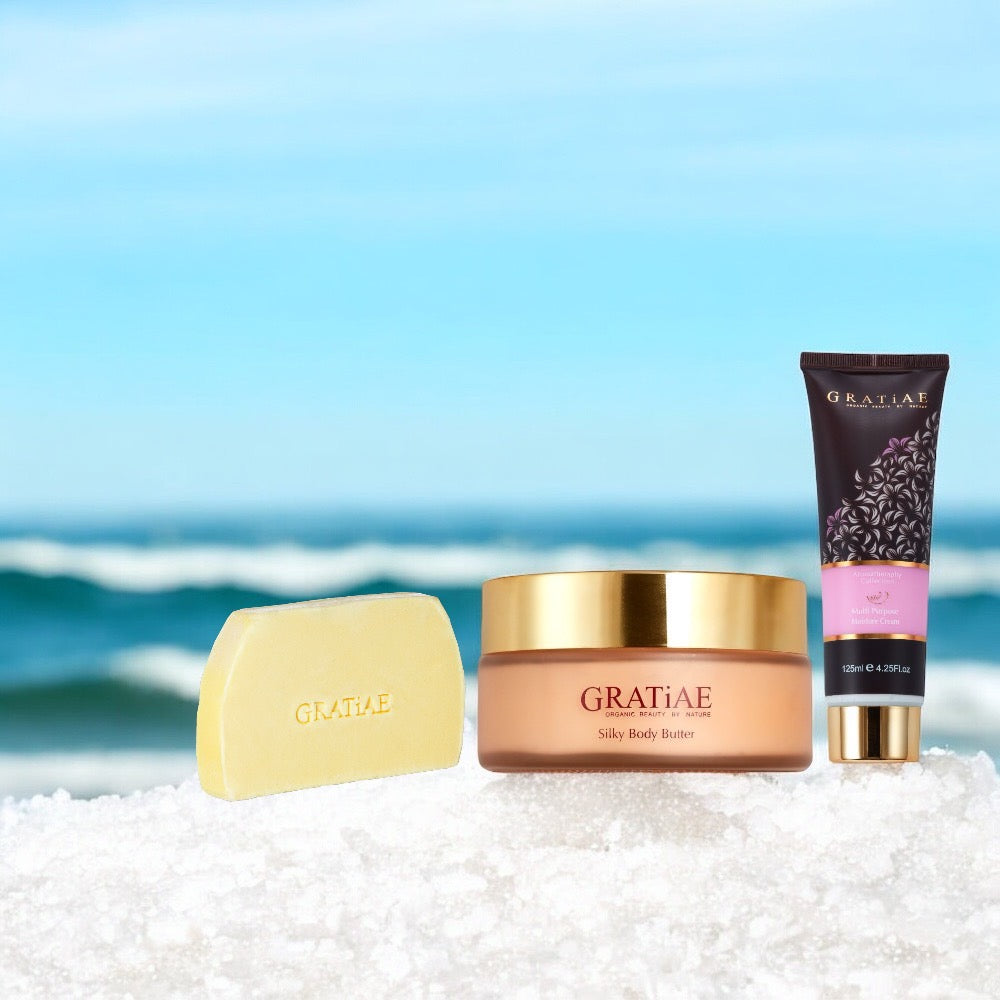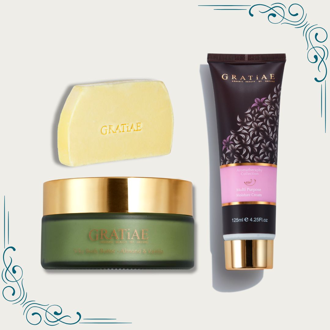 GRATiAEのボディバターは、特に乾燥肌や敏感肌に適しています。シアバターやホホバオイル、アーモンドオイルが配合されており、肌に深い潤いを与え、乾燥やかさつきに悩む肌をしっとりと整えます。普通肌や混合肌の方にも、季節的な乾燥対策としてご使用いただけます。